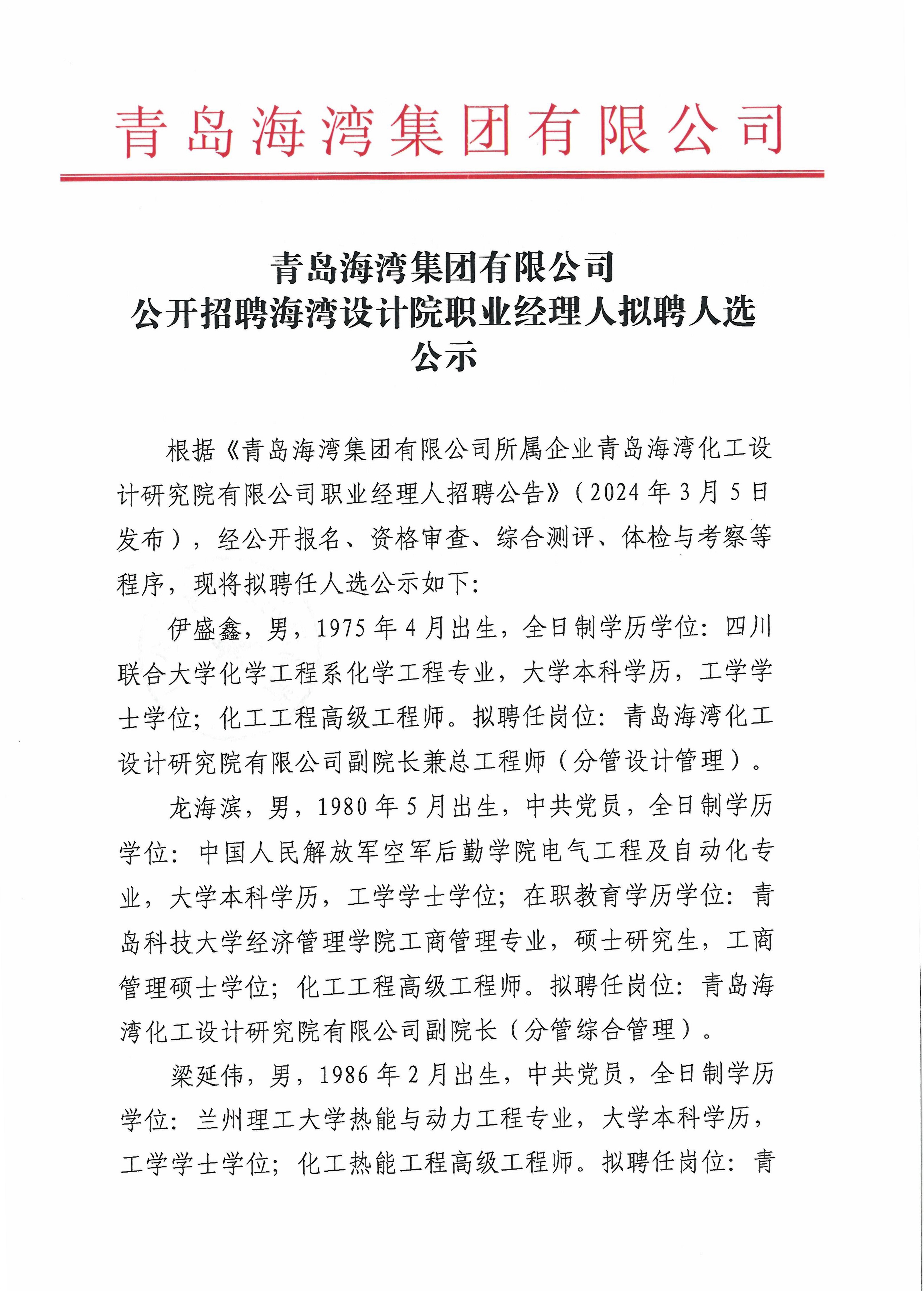 頂 青島海灣集團(tuán)有限公司公開招聘海灣設(shè)計(jì)院職業(yè)經(jīng)理人擬聘人選公示
